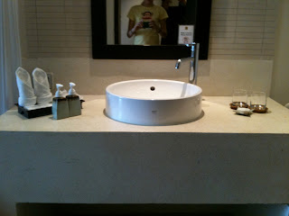 Huone oli kaunis ja valoisa. Kylppärin ja olkkari/makuuhuoneen välillä oli iso ikkuna. Sadesuihkusta saattoi katsella parvekkeen valoverhon läpi viidakkopuutarhaan. Huoneen värit olivat kauniit eikä mitään turhaa ollut. Joku ilta makoilimme sängyllä ja ihailimme huonetta ja totesimme, että onneksi sinne ei ole laitettu yhtäkään mautonta hotellihuonetaulua. Oli kiva avata ensimmäistä kertaa vaatekomero. Ensinnäkin siihen syttyi sisävalot. Ja lisäksi se sisälsi meille kunnon sateenvarjot (Thaimaan keväällä tulee lähes päivittäin sadekuuro), taskulampun, rantakassin (reilun kokoinen ja tyylikäs), aamutakit (ihanan viileät), aamutossut ja rantatossut. Niitä pieniä, mutta mieleenjääviä ja tärkeitä yksityiskohtia oli lisäksi kauniit kukat sängyllä ja kylppärissä ym.